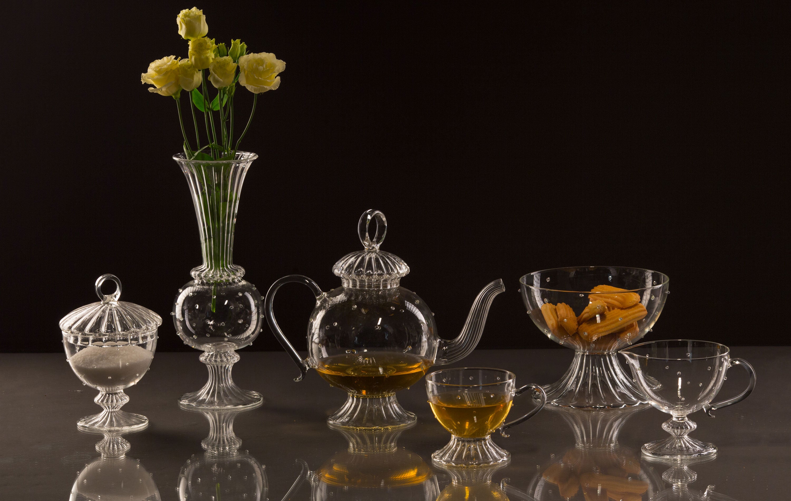 We work with borosilicate glass, a durable and stable material originally developed for demanding technical applications. We produce in small batches and keep most of our processes under one roof, reducing unnecessary transport between suppliers. We design objects that are meant to stay, not follow fast-changing trends; a good candelabra, vase or tea set should still feel right on a table ten or twenty years from now.