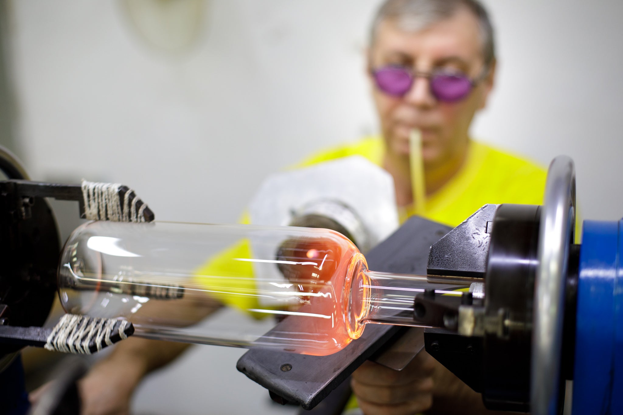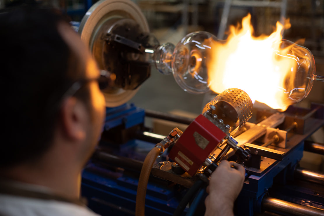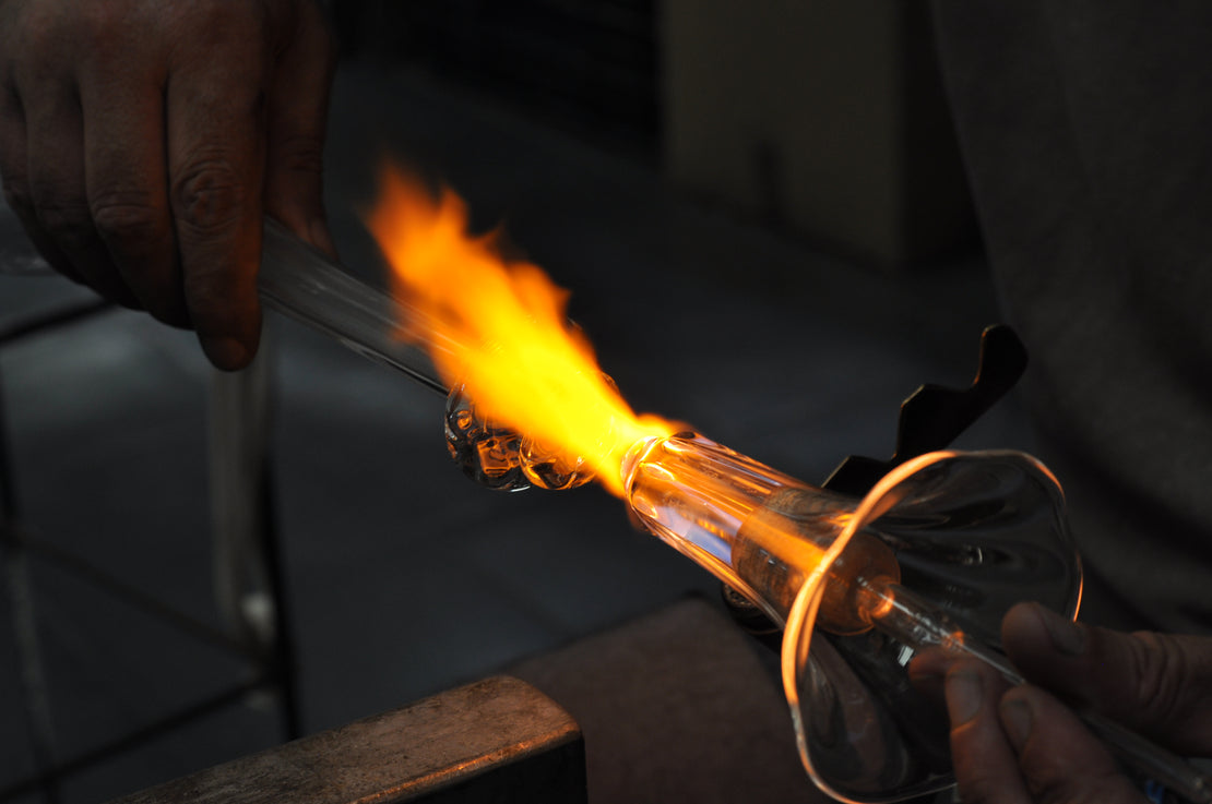 Every Gabriela Seres piece starts as a length of clear borosilicate glass tubing or rod. Our glassblowers heat it in a focused flame until it softens, turning solid material into a glowing ribbon that can be bent, stretched, sculpted and breathed into.