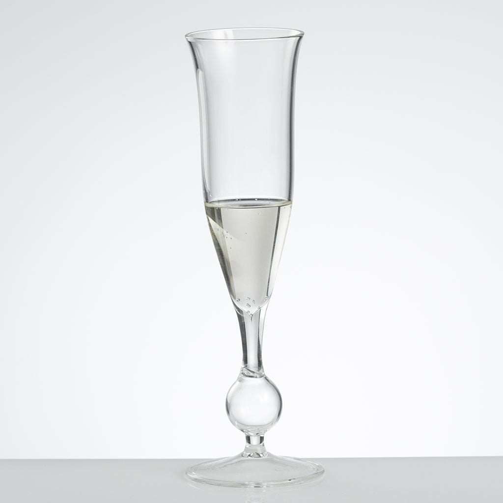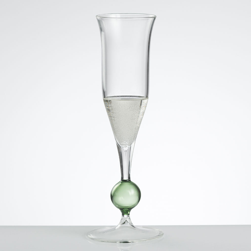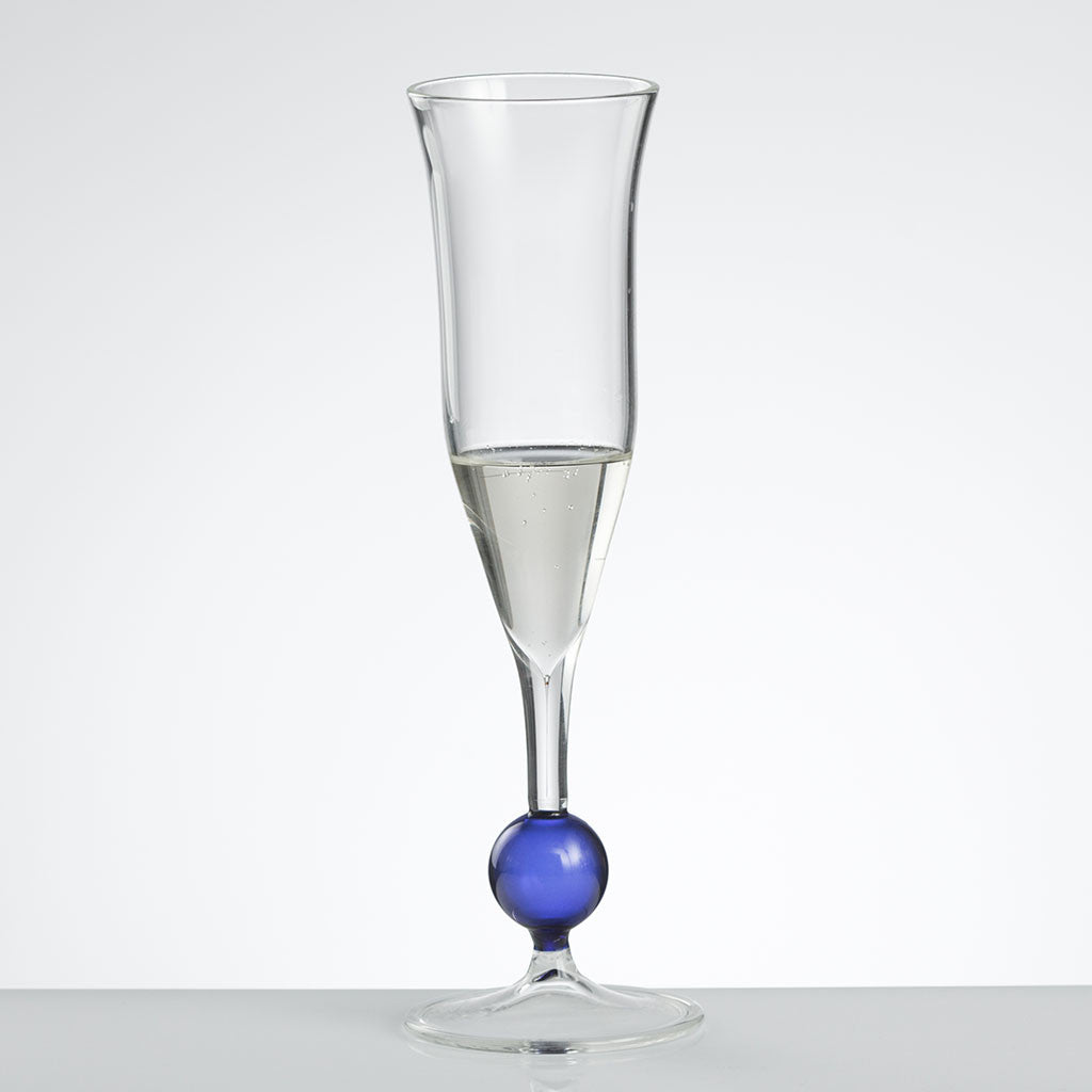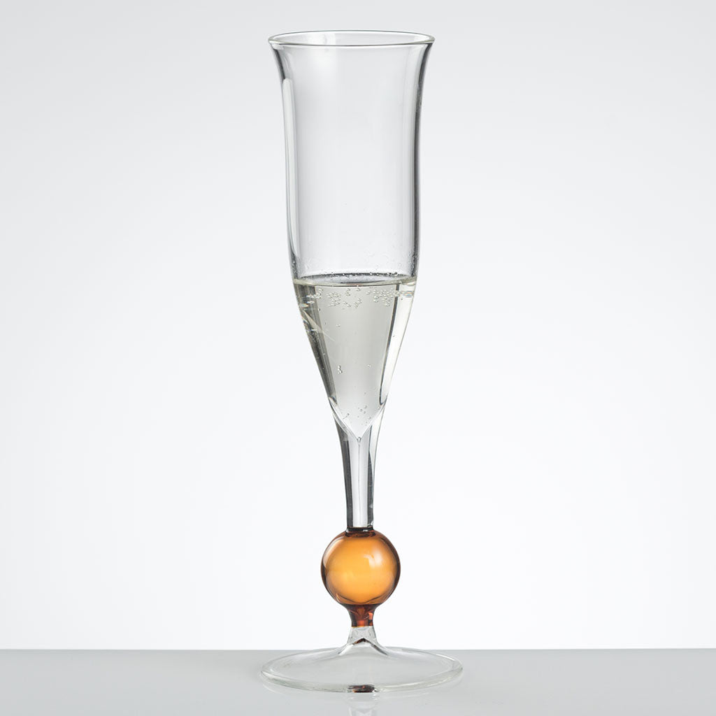 Mouth‑blown from borosilicate glass, the Bubble Champagne Flutes pair a slender silhouette with a joyful accent: a colored glass bubble on the stem. Choose clear, amber, blue, or green to add a subtle note of personality to celebrations and everyday moments alike.