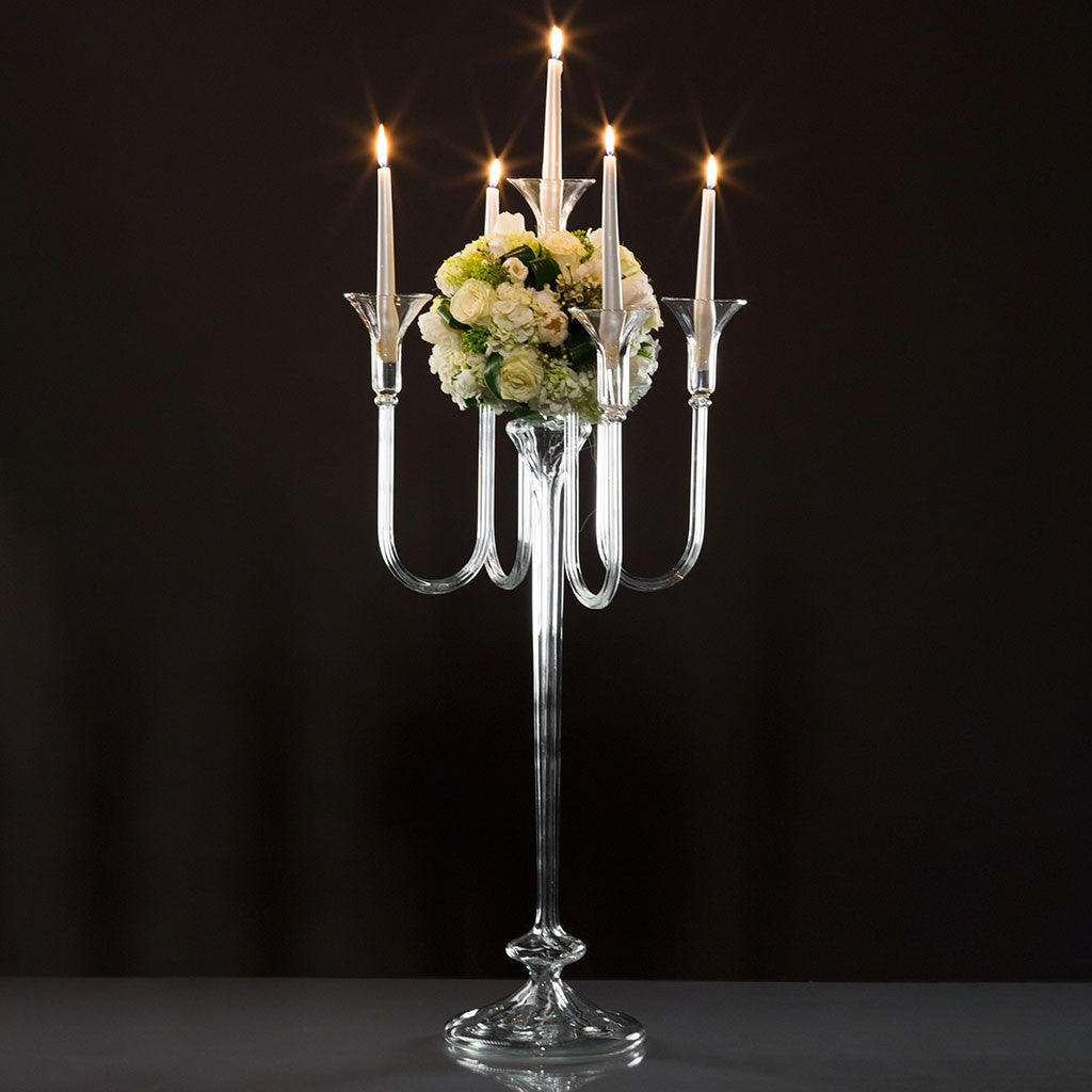 Launched in 2015, the Carmen design became our most beloved candelabra—defined by a supple, inverse-conical stem and an effortless, upright poise. In this tall edition, Carmen ascends to event scale: five clear glass arms rising in balanced symmetry, each cup catching and multiplying the flame.