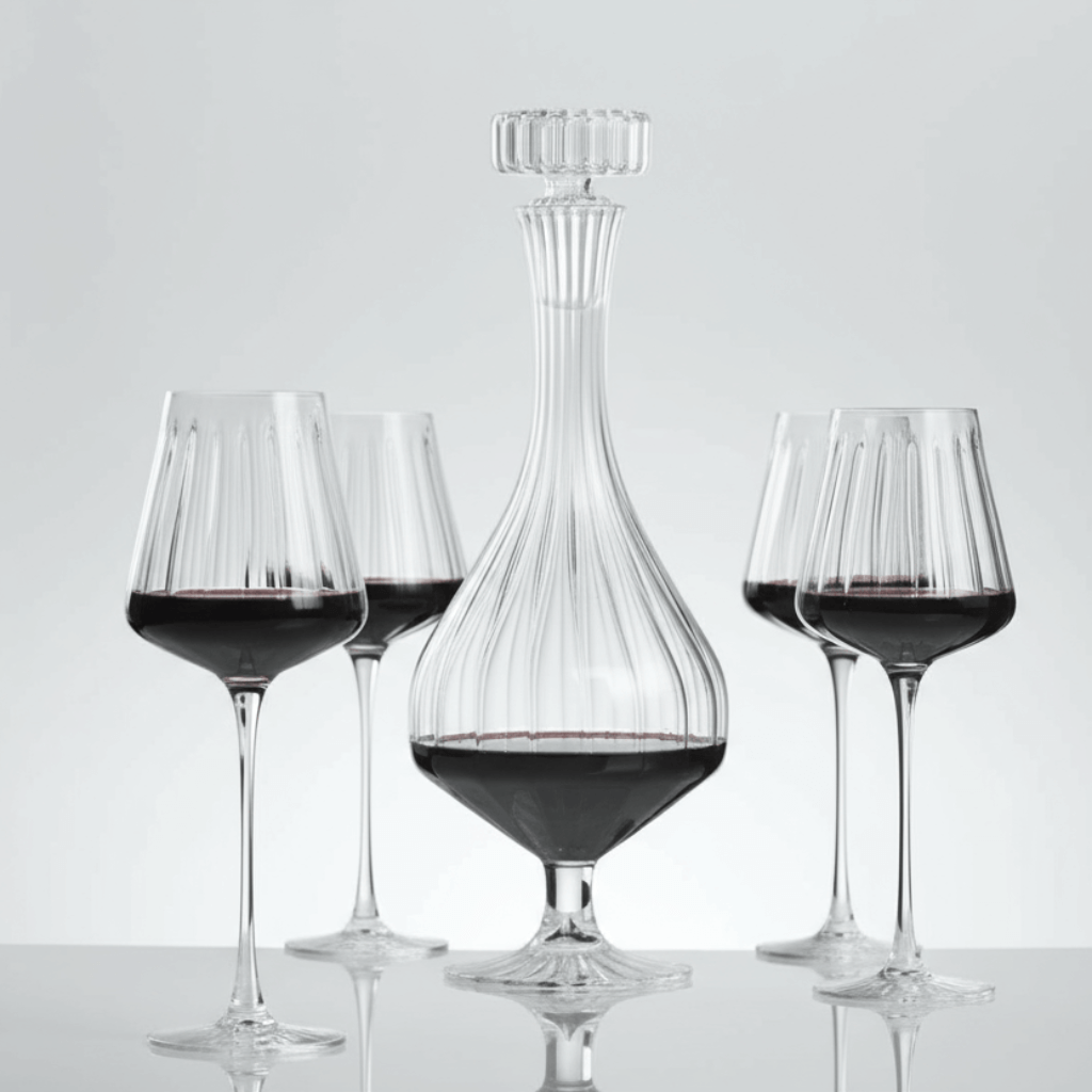 The carafe’s generous body and slender neck are designed to let wine open slowly, while the four glasses echo its architecture with sculptural bowls and fine stems. The vertical optic pattern catches and bends the light across the entire ensemble, turning serving into a quiet performance of form and transparency.