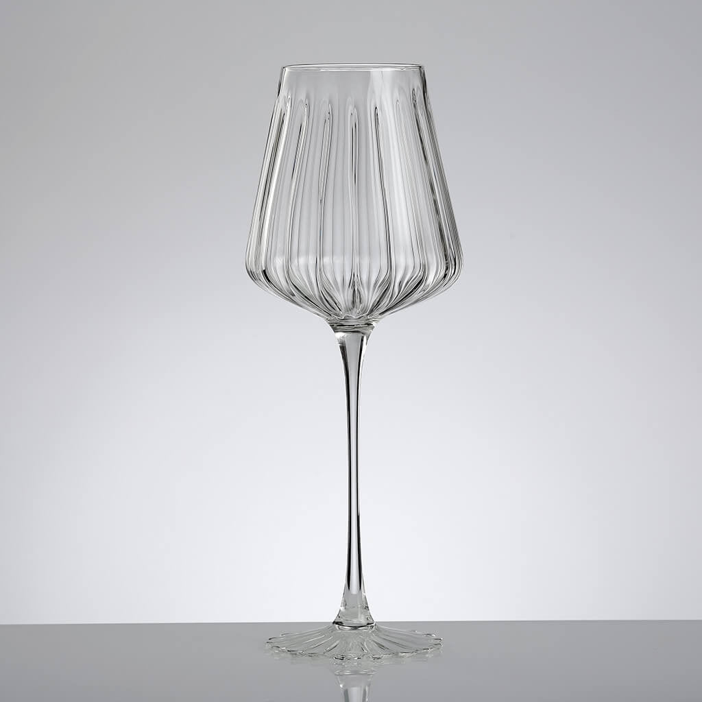 The Élysée Red Wine Glass captures the essence of fullness and warmth through its broad bowl and slender stem. Each glass is hand-blown from lined borosilicate glass in the Gabriela Seres atelier in Bucharest, where fire and breath define its gentle geometry. The optic vertical pattern plays with light, accentuating the rich color and movement of the wine within.