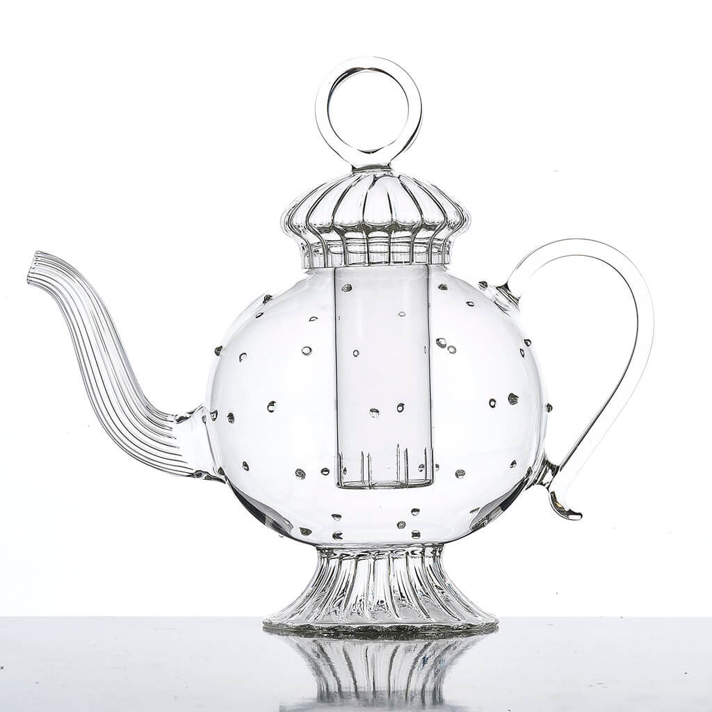 Every element is carefully shaped from borosilicate glass: a lined glass foot and spout for balance and clean pouring, a matching lined lid topped with a circular rod, and a glass infuser inside for loose-leaf tea. The flat-rod handle adds elegance and comfort in use.