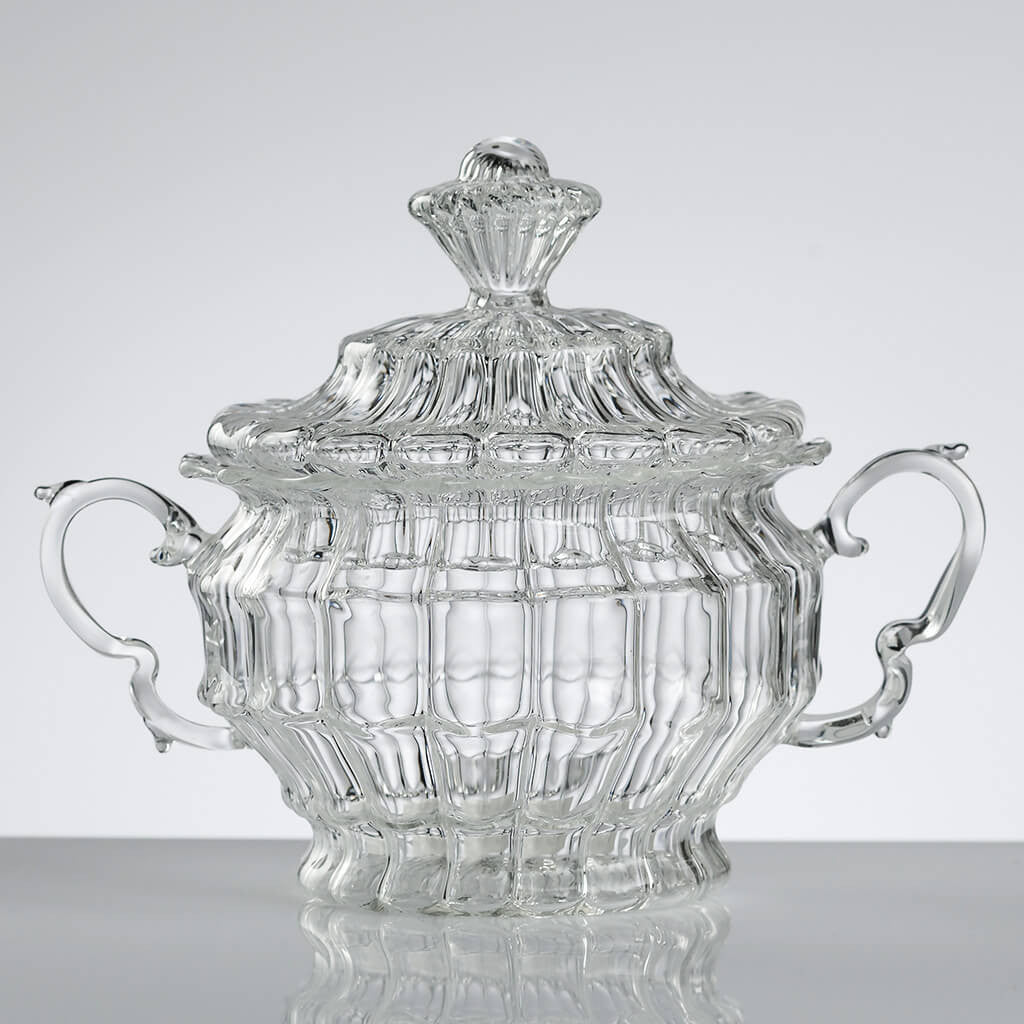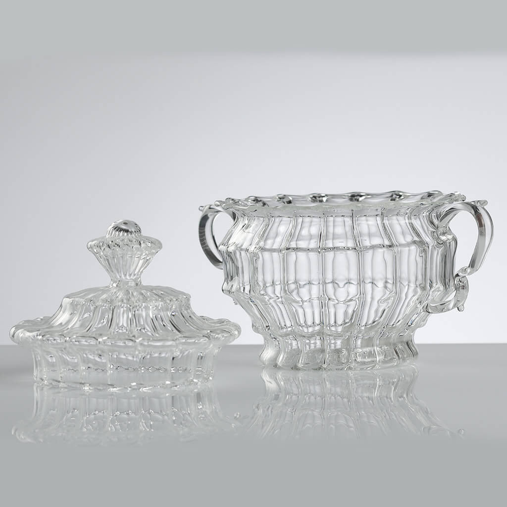 The William Sugar Bowl continues the language of the collection—refined Georgian proportion expressed through pure borosilicate glass. Each piece is hand-blown and shaped by flame in our Bucharest atelier, then delicately lined to capture light in soft vertical rhythms. The result is a sculptural form of calm precision and quiet opulence.