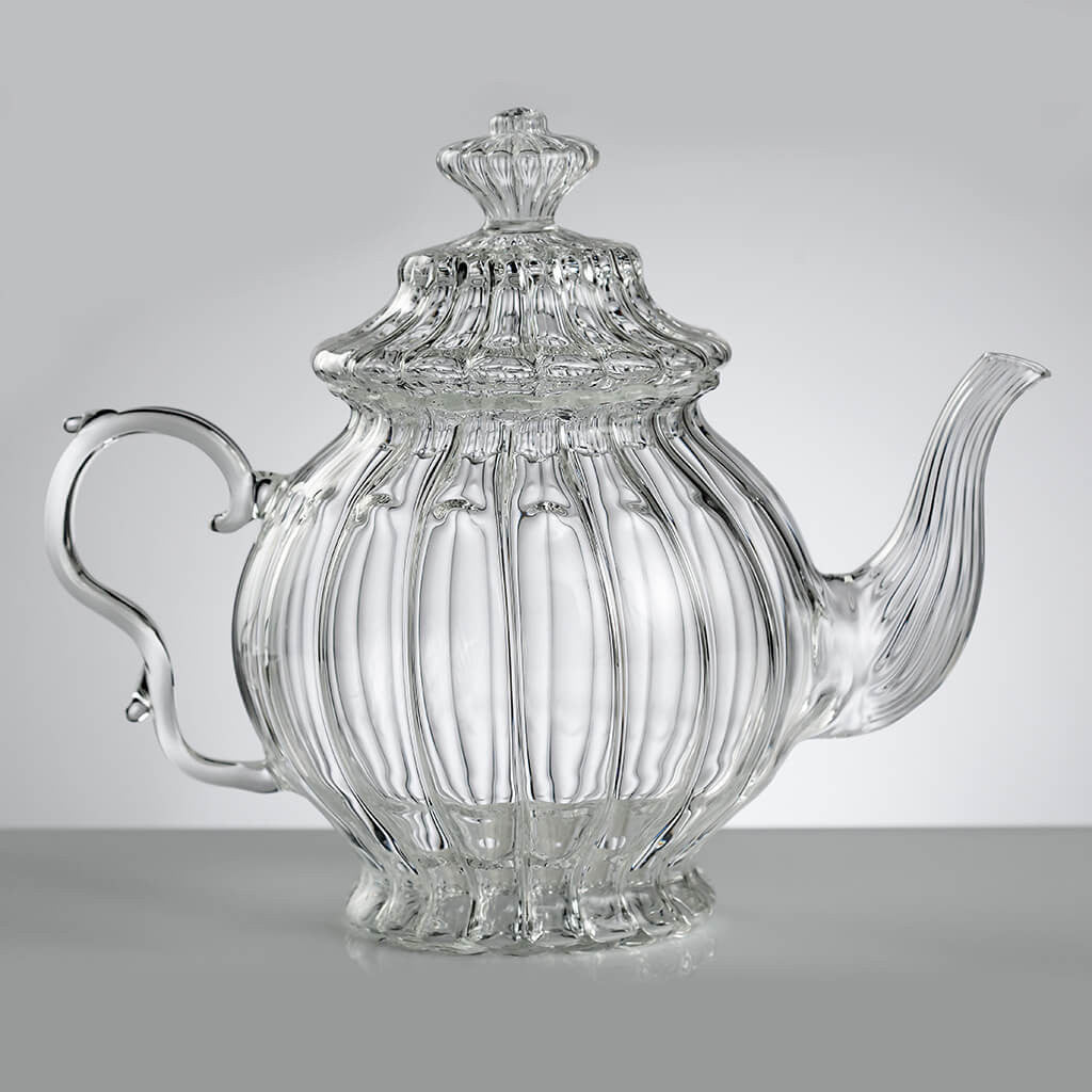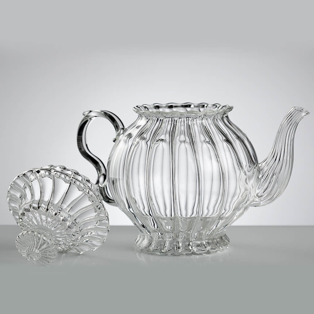Its lined surface, softly textured in the glass, catches reflections like folds of fine fabric, while the arched handle and slender spout create a balanced, effortless pour. The lid rests with quiet precision, preserving warmth and aroma for the slow ritual of tea.
